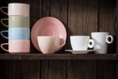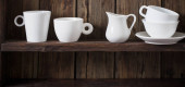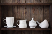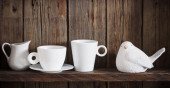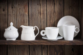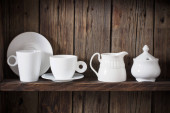 białe naczynia kuchenne na starym ciemnym drewnianym tle