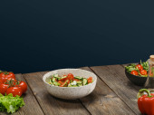 Kobieta gotuje sałatkę warzywną. Kobiece dłonie. Koncepcja diety dla zdrowego stylu życia z copyspace.