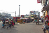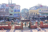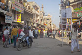 New Delhi, Indie - 21 listopada 2019: ruchliwe ulice targowe z kolorowymi domami, budynkami i tłumami ludzi, riksze w pobliżu Jama Masjid w starej części New Delhi, Indie.