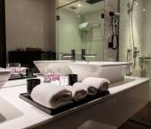 Close up shot nowoczesnej łazienki umywalka z niebieskim podświetleniem lustro, mydło w płynie, krem i inne przybory toaletowe. Biała ceramiczna umywalka we współczesnym stylu minimalizmu. Przestrzeń kopiowania, tło.