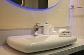 Zdjęcie "Szczelnie ujęcie nowoczesnej łazienki umywalka z niebieskim lustrzanym podświetleniem. Biała ceramiczna umywalka we współczesnym stylu minimalizmu. Przestrzeń kopiowania, tło." może być wykorzystywane do celów osobistych i komercyjnych zgodnie z warunkami zakupionej licencji Royalty-free. Obraz jest dostępny do pobrania w jakości wysokiej rozdzielczości do 5760x3840.