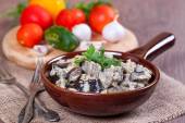 Bakłażan duszony z warzywami i śmietaną na patelni na drewnianym stole