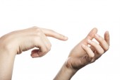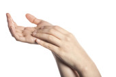 Kobieta dwie ręce dotykają się dla kosmetyku odizolowany na białym.