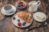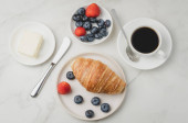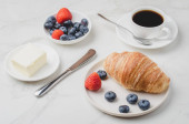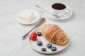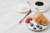Pyszne śniadanie ze świeżą kawą, świeże rogaliki i jagody. Ognisko selektywne