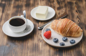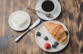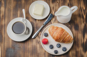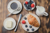 Kubek kawy, rogalik z jagodami w białej misce i nóż do masła na drewnianym stole. Widok z góry i kopiowanie. Zdrowe śniadanie ze świeżych jagód