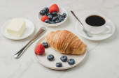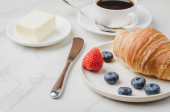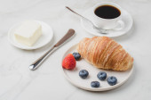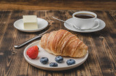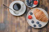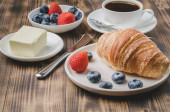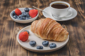 Kubek kawy, rogalik z jagodami w białej misce i masło na drewnianym tle. Zdrowe śniadanie ze świeżych jagód