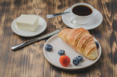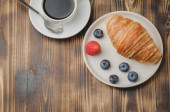 Kubek kawy, rogalik z jagodami w białej misce i nóż do masła na drewnianym stole. Widok góry. Zdrowe śniadanie ze świeżych jagód