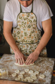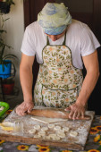 W kuchni, człowiek przygotowuje ukraińskie danie narodowe pierogi z ziemniakami.2020