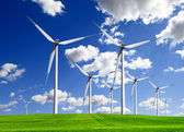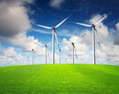 Turbiny Wint oh zielone wzgórze i błękitne niebo. Alternatywne źródło energii.