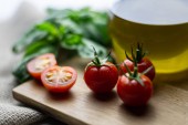 Świeże kolorowe pomidory, bazylia i oliwa z oliwek na białym stole. Widok z góry z kopia spac