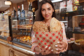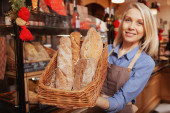 Zdjęcie "Piękna wesoła kobieta piekarz trzymając koszyk pełen pysznego świeżego chleba do kamery" może być wykorzystywane do celów osobistych i komercyjnych zgodnie z warunkami zakupionej licencji Royalty-free. Obraz jest dostępny do pobrania w jakości wysokiej rozdzielczości do 5760x3840.