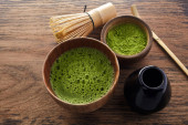 Matcha w proszku. Organiczna ceremonia zielonej herbaty matcha. Zdrowy drink. Tradycyjny japoński napój na czarnym drewnianym tle