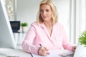 Dojrzała para zajmuje się finansami rodzinnymi w domu. Starsza para omawia ekonomię domu siedząc przy biurku i korzystając z laptopa.