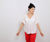 Szczęśliwy przerośnięty model pozowanie przed kamerą.