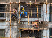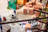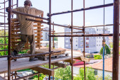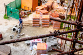 Zdjęcie "Pracownicy czekają dźwig zachować równowagę i kierunek do taczki, z zaprawy do umieszczenia na platformie rusztowania." może być wykorzystywane do celów osobistych i komercyjnych zgodnie z warunkami zakupionej licencji Royalty-free. Obraz jest dostępny do pobrania w jakości wysokiej rozdzielczości do 5760x3840.
