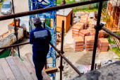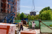 Pracownicy czekają dźwig zachować równowagę i kierunek do taczki, z zaprawy do umieszczenia na platformie rusztowania.