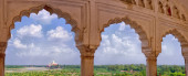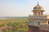 Taj Mahal podczas zachodu słońca i rzeki Yamuna, w Agrze, Uttar Pradesh, Indie