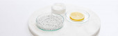 widok z góry marmurowej deski w pobliżu kolce lagurusa na beżowym tle