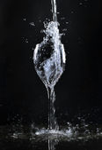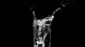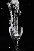 czarno-biały rozprysk wody w szklance, przez rozpryskiwanie wody w tle