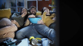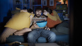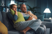 Przyjaciele siedzą na kanapie w domu, oglądają filmy i jedzą razem popcorn.