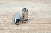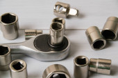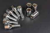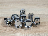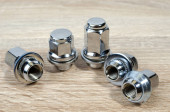 nakrętki koła samochodu izolowane na tle stołu, nakrętki koła części samochodowych. Zbliżenie różnych nakrętek stalowych