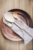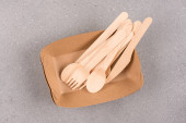 Ekologiczne biodegradowalne kartony lub papierowe naczynia. Koncepcja zerowego recyklingu odpadów. Catering i ulicy fast food papierowe kubki, talerze i widelce drewniane.