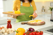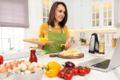 Kobieta z tabletkami gotowania przy stole w kuchni