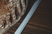 Świeżo upieczony chleb żytni w papierze rzemieślniczym na ciemnobrązowym tle. Produkcja rękodzieła. Widok z góry, przestrzeń kopiowania.