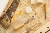 Różne narzędzia stolarskie na drewnianym stole gotowe do naprawy.