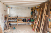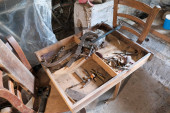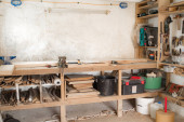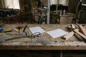 Różne narzędzia stolarskie na drewnianym stole gotowe do naprawy.