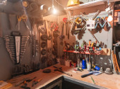 Różne narzędzia stolarskie na drewnianym stole gotowe do naprawy.