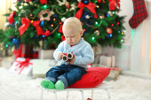 wesoły mały chłopiec bawi się jego czerwony Samochodzik