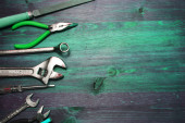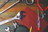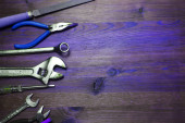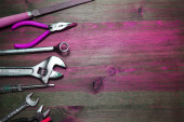 kompozycja jasnoróżowych instrumentów do prac na drewnianym tle