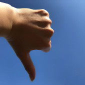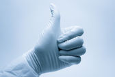 Ręka w białej rękawicy odizolowana na biało z kciukiem do góry.