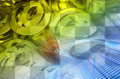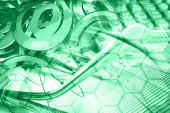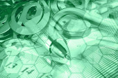 Kolaż biznesowy ze znakami pocztowymi, wykresami i długopisem.