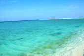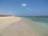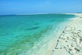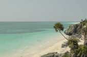 Plaża karaibska ze spokojnymi i turkusowymi wodami. Jasnoniebieskie bezchmurne niebo, z hamakiem plażowym