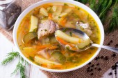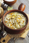 Zupa z gryką, warzywami i kurczakiem. Skupienie selektywne.