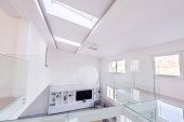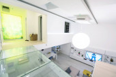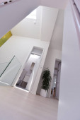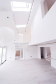 stylowe wnętrze z drewnianymi schodami w dużym, nowoczesnym, dwupoziomowym apartamencie