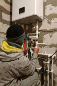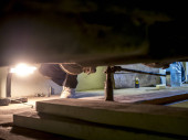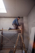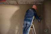 Widok z tyłu profesjonalnych robotników budowlanych montujących pod dachem warstwę izolacji termicznej z wełny mineralnej