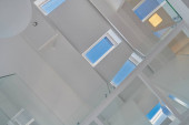 stylowe wnętrze z drewnianymi schodami w dużym, nowoczesnym, dwupoziomowym apartamencie