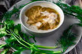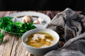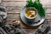 Zupa z puree i ziemniakami. Ozdobiona zieloną cebulą i groszkiem z małych ziaren ze słoika. Podawanie w ceramicznym garnku na zwęglonym drewnianym tle z tkaniną i naturalnym drewnem