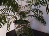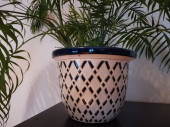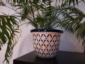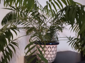 Zdjęcie "Zielona palma w sprawdzonym naczyniu na wzór przed białą ścianą w mieszkaniu" może być wykorzystywane do celów osobistych i komercyjnych zgodnie z warunkami zakupionej licencji Royalty-free. Obraz jest dostępny do pobrania w jakości wysokiej rozdzielczości do 5760x3840.