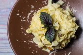 gorący smażony omlet z siekaną zieloną cebulą w talerzu na drewnianym stole