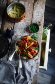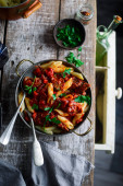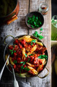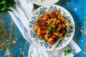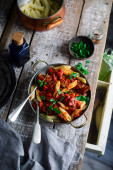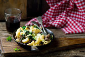 Makaron z wątróbką królika i sosem pomidorowym.style rustic.selective focus