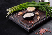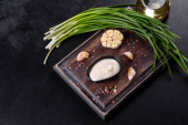 Pyszna piękna zupa grzybowa w brązowym talerzu z drewnianą łyżką na ciemnobrązowym tle
