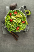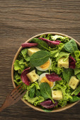 Sałatka z zielonej sałaty ze świeżych warzyw na drewnianym tle stołu