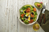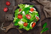 Zdjęcie "Sałatka z zielonej sałaty ze świeżych warzyw na drewnianym tle stołu" może być wykorzystywane do celów osobistych i komercyjnych zgodnie z warunkami zakupionej licencji Royalty-free. Obraz jest dostępny do pobrania w jakości wysokiej rozdzielczości do 5760x3840.