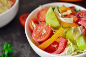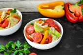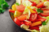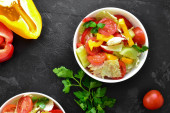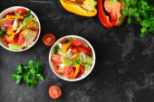 Zdjęcie "Sałatka warzywna. Ciemne tło, widok z góry." może być wykorzystywane do celów osobistych i komercyjnych zgodnie z warunkami zakupionej licencji Royalty-free. Obraz jest dostępny do pobrania w jakości wysokiej rozdzielczości do 5760x3840.