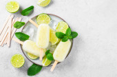 Domowej roboty lizak awokado. Wegańskie lody nie-mleczne. Awokado, wapno i kokos zdrowy lizak na szarym kamiennym tle ze świeżymi plastrami wapna, awokado i lodem