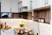 Zdjęcie "Panorama eleganckiej kuchni z białymi meblami i czarnymi blatami" może być wykorzystywane do celów osobistych i komercyjnych zgodnie z warunkami zakupionej licencji Royalty-free. Obraz jest dostępny do pobrania w jakości wysokiej rozdzielczości do 5760x3840.